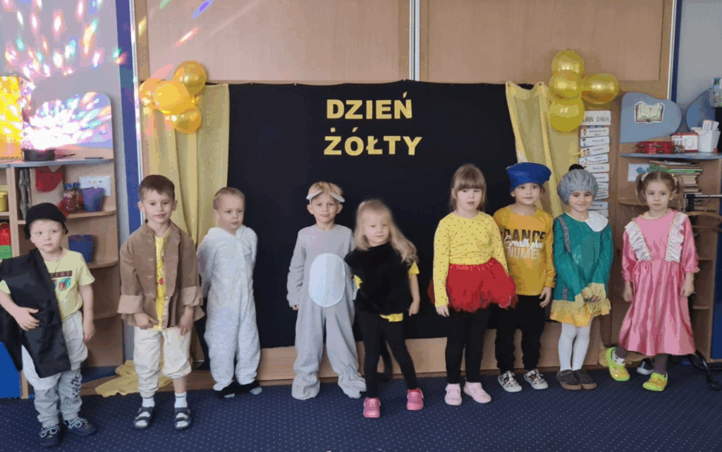 Dzieci rozpoczynały dzień z piosenką „Tęcza”słuchanej już od progu szatni. Kolor żółty królował w salach, w strojach naszych przedszkolaków i w tematyce spotkań. Dzień był wypełniony warsztatami i zabawami związanymi z teatrem i rozwojem mowy.