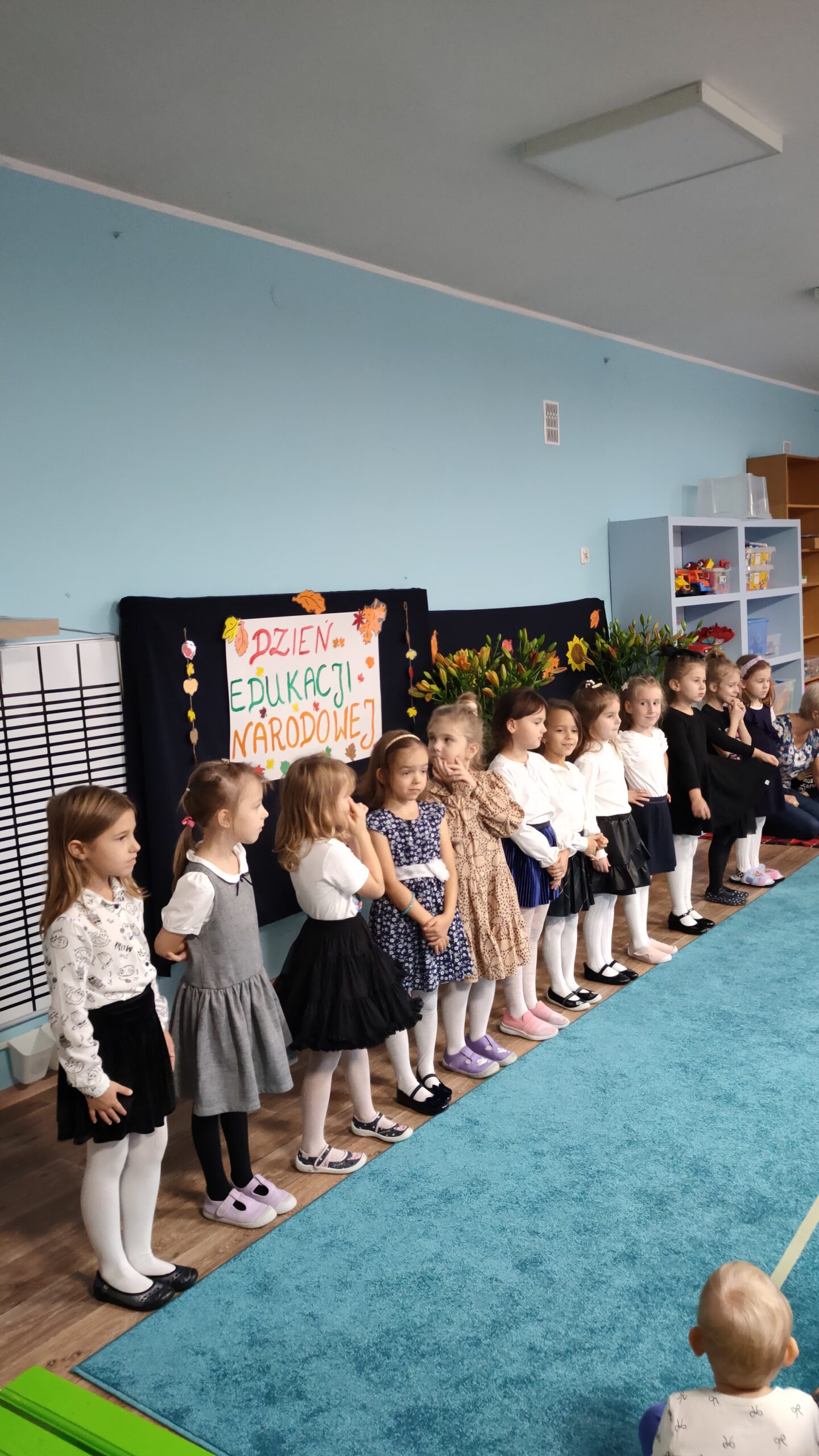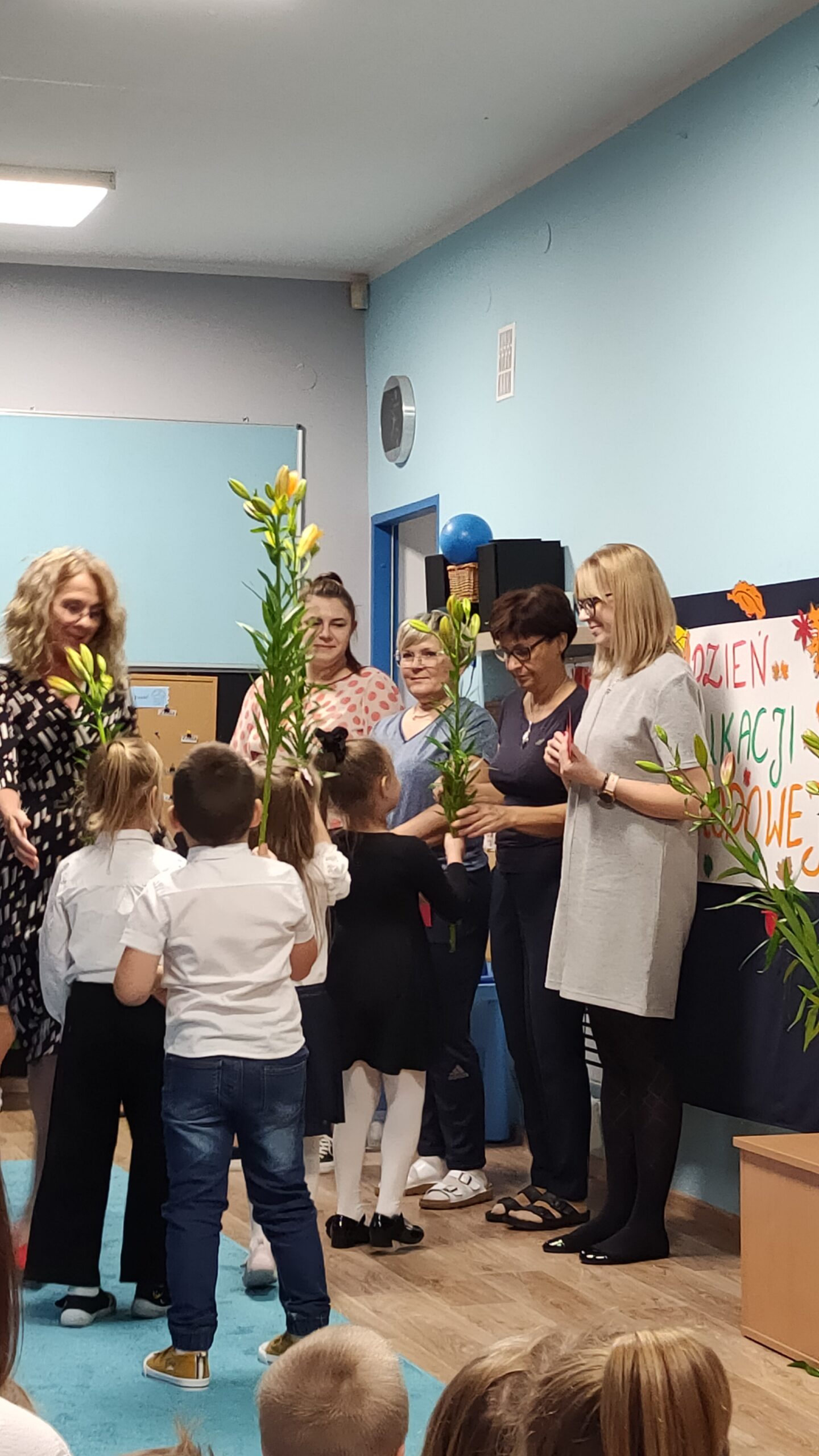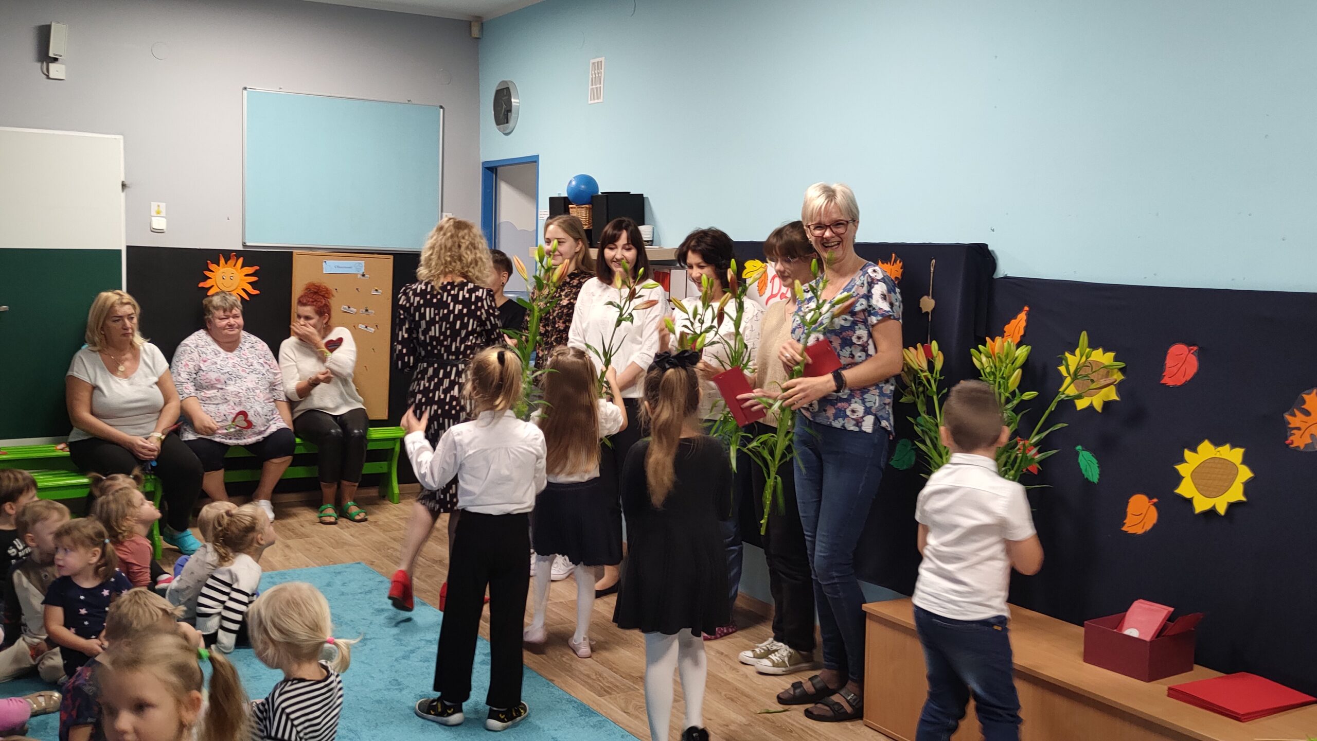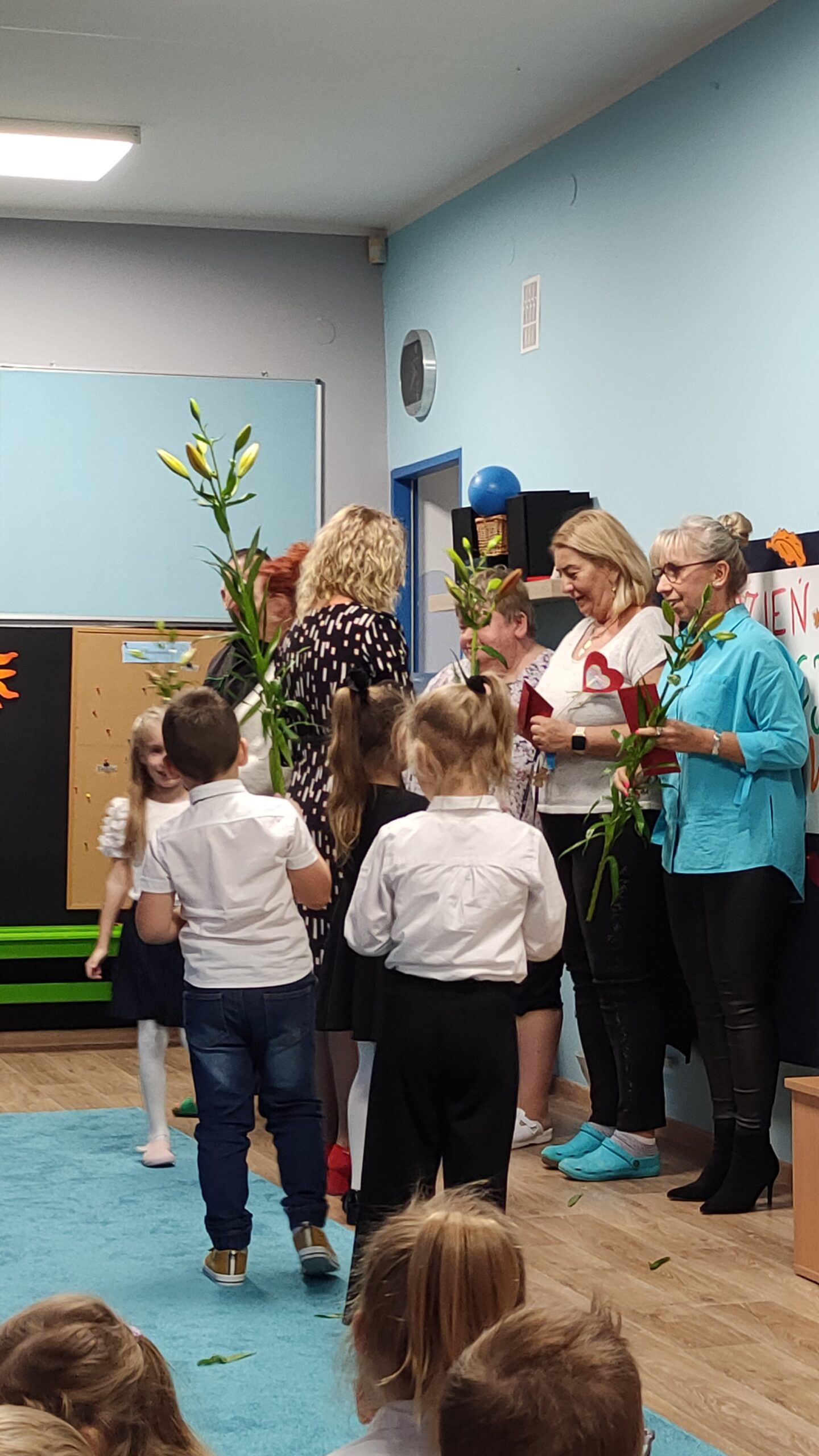Dzień Nauczyciela w naszym przedszkolu był wyjątkowym świętem pełnym wzruszeń i uśmiechów! Najstarsze grupy przedszkolaków, Duszki oraz Koniczynki przygotowały krótkie, ale urocze przedstawienie, które wprowadziło wszystkich w radosny nastrój. Ich występ został przyjęty entuzjastycznie, a każdy maluch wkładał w niego swoje serce. Po występie, Pani Dyrektor wręczyła nagrody oraz złożyła podziękowania wszystkim nauczycielom, wyrażając wdzięczność za ich zaangażowanie i pracę na rzecz dzieci. Cała społeczność przedszkolna – dzieci, nauczyciele i pracownicy – świętowała razem, dzieląc się miłymi chwilami i słodkim poczęstunkiem.