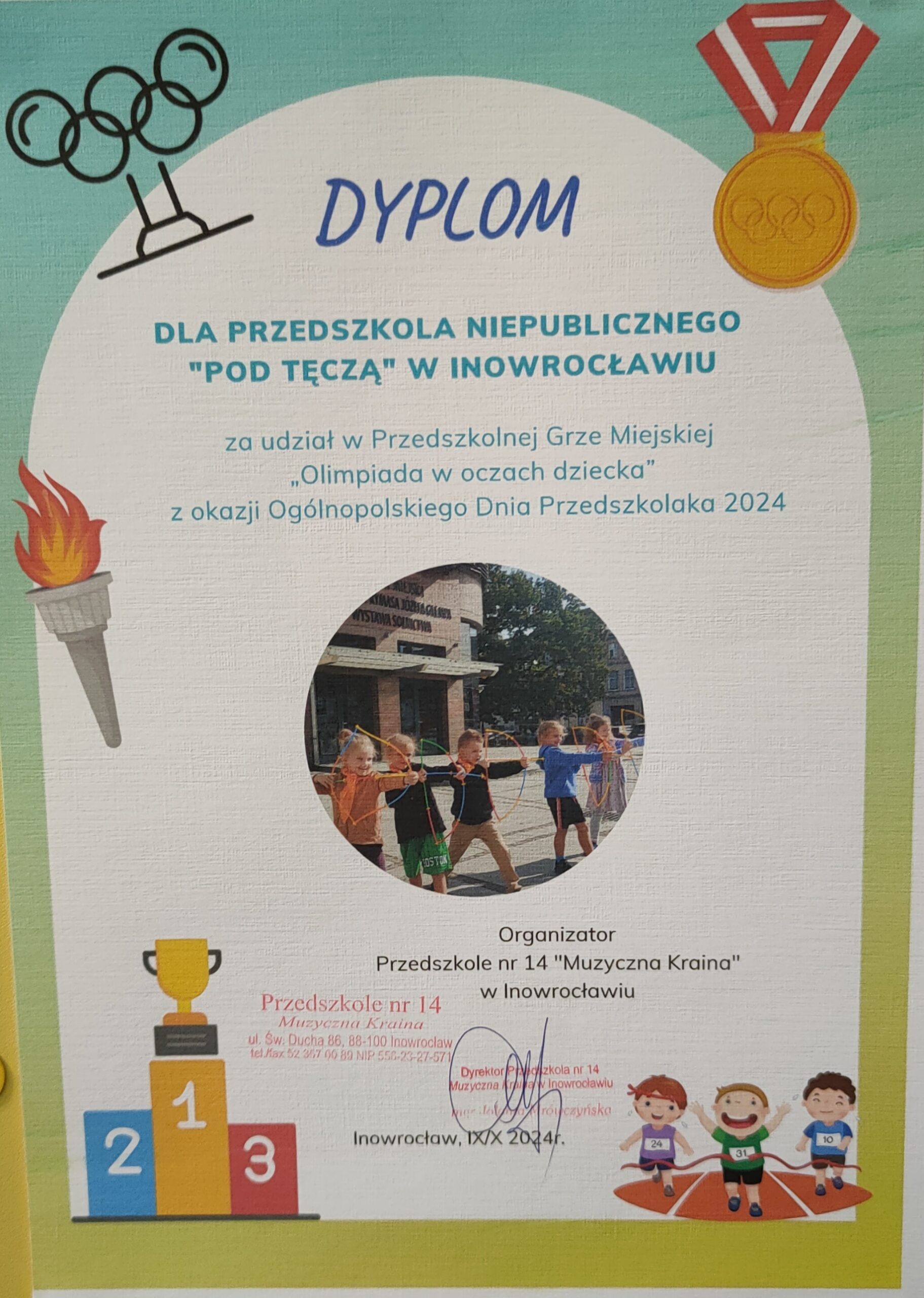 Z okazji Dnia Przedszkolaka dzieci z grupy Duszki wzięły udział w grze miejskiej organizowanej przez przedszkole Muzyczna Kraina, która polegała na ukazaniu igrzysk olimpijskich w oczach dziecka w miejscu charakterystycznym dla naszego miasta. Tęczynki zdecydowały się odwzorować łucznictwo.