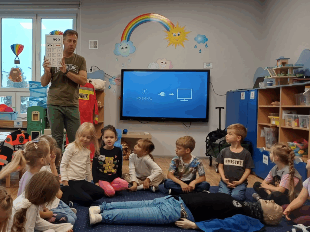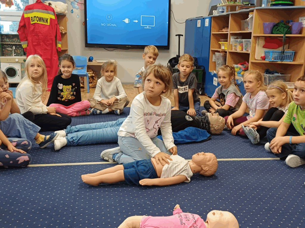 Pan Dominik uczy nasze 6-latki jak wezwać pomoc, sprawdzić czynności życiowe, a nawet wznowić pracę serca. Przybliża też tajniki pracy ratownika medycznego.
